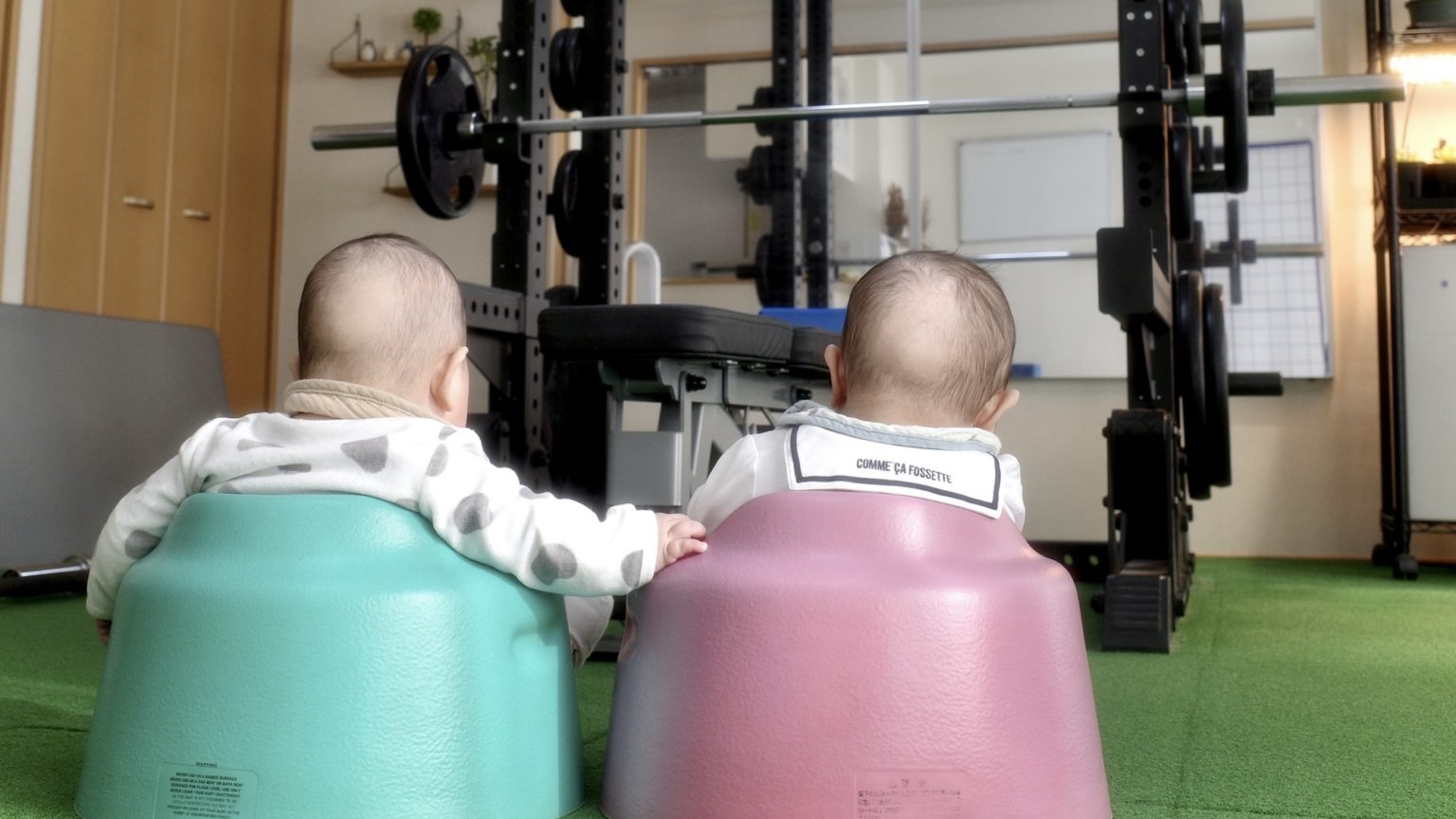子育て中の妻も運動出来る機会を作ろう!という事で、私のジムでトレーニングをスタートしました。最初はジムのストレッチマットに寝かせていた息子も、今ではベビーソファに座れる様になってきました。